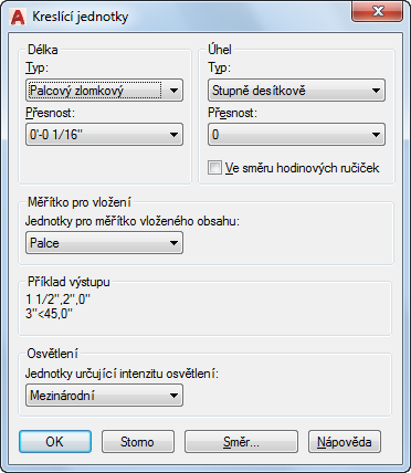Hodnoty v seznamu jsou Exponenciální, Desítkový, Palcový desetinný, Palcový zlomkový a Zlomkový. Formáty Palcový desetinný a Palcový zlomkový nastavují zobrazení ve stopách a palcích, přičemž se předpokládá, že každá výkresová jednotka odpovídá jednomu palci. Ostatní formáty mohou používat libovolnou reálnou jednotku.