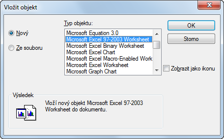 Převede vložený objekt na typ vybraný v poli Typ objektu.