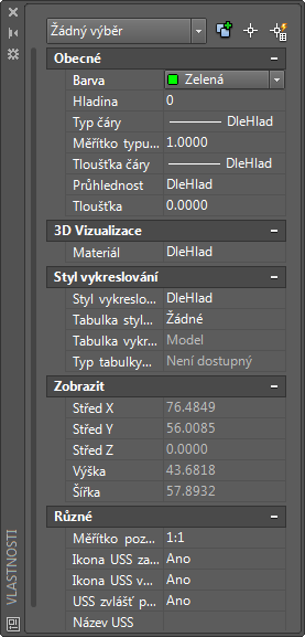 • Pokud nejsou vybrány žádné objekty, můžete zobrazit a změnit aktuální vlastnosti, které se použijí pro všechny nové objekty.