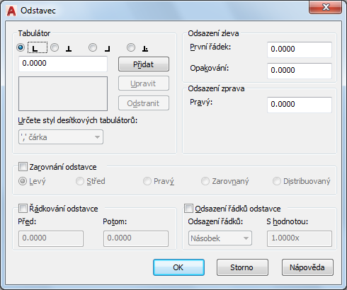 Zobrazí volby tabulátoru včetně možností přidávání a odstranění. Možné tabulátory jsou levý, střed, pravý a desetinný. Tabulátory lze také nastavit tlačítkem Výběr tabulátoru na pravítku Editoru na místě.