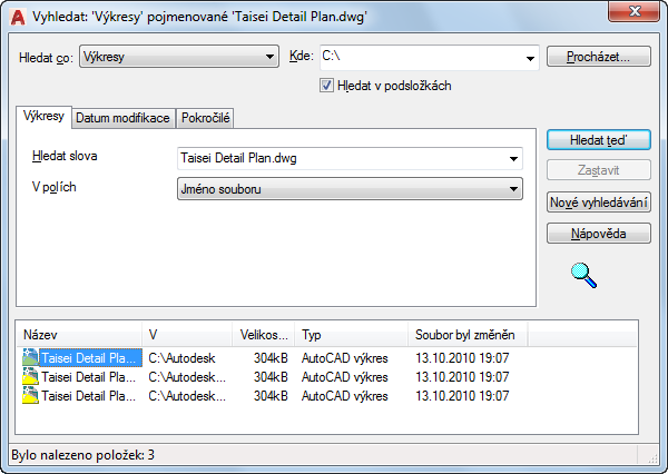 Najde obsah ve výkresech. Tato karta je dostupná, pouze pokud zvolíte v seznamu Hledat co položku Výkresy.