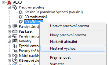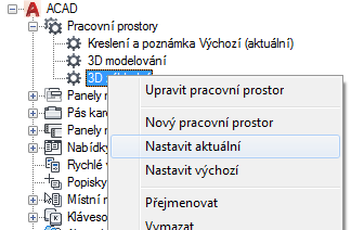 Nastavení aktuálního pracovního prostoru v editoru Upravit uživatelské rozhraní (CUI):