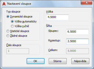 Zobrazí a určí šířku sloupce a rozestupu. Rozteč sloupců je pětinásobkem výchozí výšky textu.
