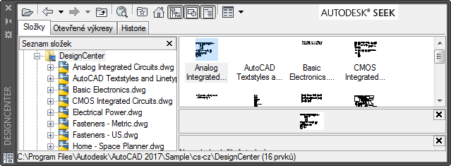Pomocí stromového zobrazení vlevo lze procházet zdroje obsahu a zobrazovat obsah v oblasti pro obsah vpravo. Z oblasti pro obsah můžete přidávat položky do výkresu nebo do palety nástrojů. Pro vybrané výkresy, bloky, šrafovací vzory nebo externí reference se zobrazuje náhled nebo popis.