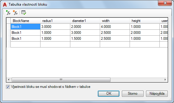 Vlastnosti bloku se musí shodovat s řádkem v tabulce