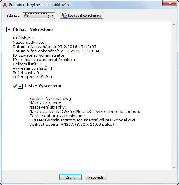 Zobrazí informace o dokončených úlohách vykreslování a publikace a listech těchto úloh.