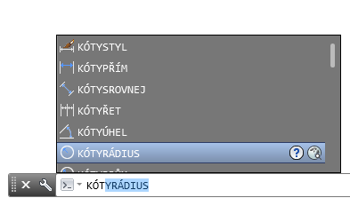 Pokud začnete psát název příkazu nebo systémové proměnné na příkazovém řádku, funkce automatického dokončování zobrazí možnosti volby. Pokud například zadáte kóty, zobrazí se všechny příkazy a systémové proměnné, které začínají těmito znaky, jak je znázorněno na ukázce.