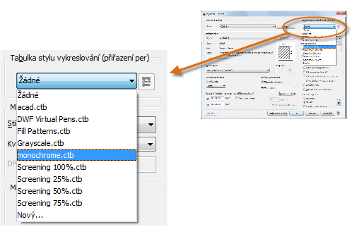 Tabulka stylu vykreslování poskytuje informace o zpracování barev. Barvy, které na monitoru vypadají dobře, nemusejí být vhodné pro soubor PDF nebo pro tisk. Můžete například vytvořit barevný výkres, ale černobílý výstup. Následující postup slouží k určení černobílého výstupu: