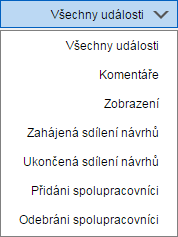 - sledovat události všech sdílení návrhů, která vlastníte, a na kterých spolupracujete. Příchozí a nové události se zobrazují s bílým pozadím. Panel Události zobrazuje: