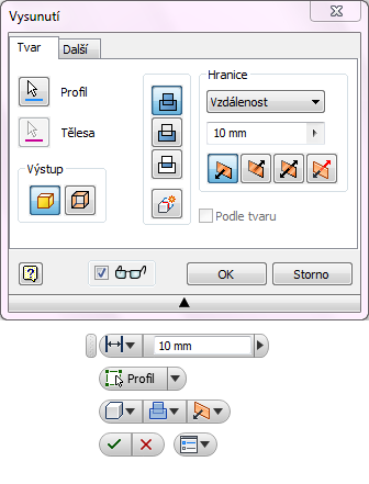 Jedná se o 7 dialogů aplikace Inventor, které mají miniaturní panel nástrojů, který se zobrazuje spolu s nimi. Možnosti dostupné na těchto miniaturních panelech nástrojů jsou stejné jako v příslušných dialozích. Při použití následujících 7 příkazů lze zobrazit či skrýt miniaturní panel nástrojů: Vysunutí, Rotace, Zaoblení, Skořepina, Zešikmení plochy, Zkosení a Spoj.