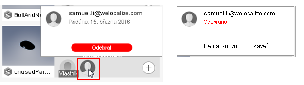 Pokud po odebrání spolupracovníka kliknutím na položku Zavřít neodeberete jeho miniaturu, zůstane zachována jako nepoužívaná. Pokud chcete spolupracovníka znovu přidat, pozastavte ukazatel myši nad deaktivovanou miniaturou a vyberte možnost Znovu přidat. Znovu přidaný spolupracovník obdrží e-mailovou pozvánku ke spolupráci na sdílení návrhu.