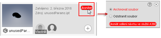 - Ukončení sdílení návrhu: Klikněte na ikonu ukončení v pravém horním rohu. Poté můžete vybrat, zda chcete sdílení návrhu archivovat nebo odstranit.