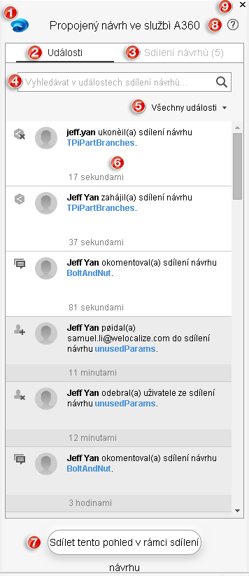 Zobrazuje všechny události sdílení návrhů, jejichž jste vlastníkem a na kterých spolupracujete. Událost je jakákoliv akce provedená vámi nebo vašimi spolupracovníky, s nimiž sdílíte sdílení návrhu. Příchozí a nové události se zobrazují s bílým pozadím.