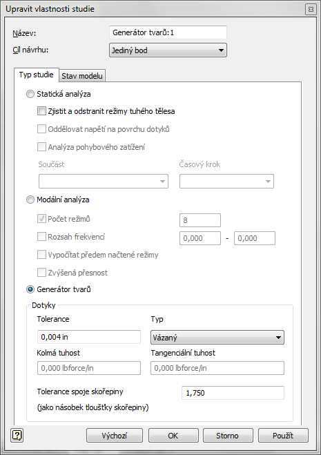 Generátor tvarů lze otevřít přímo v rámci základního postupu modelování nebo jako součást postupu pevnostní analýzy.