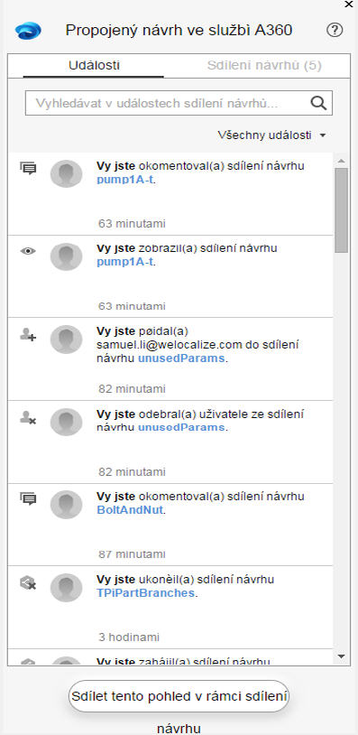 Sdílení návrhu je dostupné v aplikaci Inventor 2016 R3, Inventor 2017 a v umístění vlastníka a spolupracovníků ve službě A360 Drive. Ve složce SDÍLENÉ SE MNOU ve webové službě A360 Drive se zobrazují odkazy na všechna sdílení návrhů, která jsou s vámi sdílena. Složka VLASTNĚNÉ MNOU obsahuje všechna sdílení návrhů, která vlastníte ve složce Sdílení návrhů aplikace Inventor.