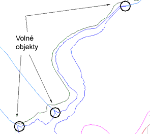 Volný konec je často způsoben nepřesnou digitalizací, když objekt přesahuje za zamýšlený průsečík s cílovým objektem. Před použitím příkazu Vymazat volné objekty použijte příkaz Přerušit zkřížené objekty.