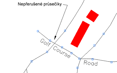 Uzavřené objekty, například vrstevnice nebo jezera, lze začistit pomocí možností Přerušit křížící se objekty a Vymazat volné objekty. Pomocí příkazu Přerušit zkřížené objekty vytvořte samostatné objekty a pak použijte příkaz Vymazat krátké objekty nebo příkaz VYMAŽ. Zkontrolujte, zda má tvar vytvořený po úpravách požadovaný tvar a nevytvořila se zdeformovaná uzavřená plocha.
