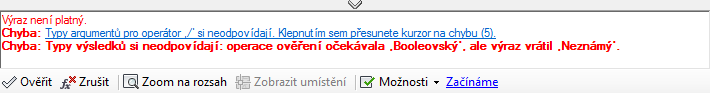 Při ukládání výrazu vždy proběhne kontrola, zda je výraz platný. Platnost výrazu můžete také zkontrolovat před jeho uložením.