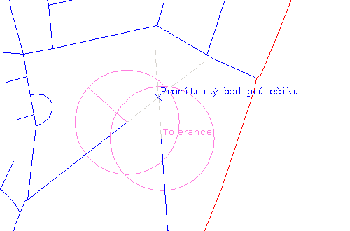 Tolerance je použita jako poloměr od konce dvou spojnic. Jestliže se koncové body a zdánlivý průsečík nacházejí uvnitř zadaného poloměru tolerance a lze objekty prodloužit bez změny jejich směru, budou prodlouženy ke zdánlivému průsečíku.
