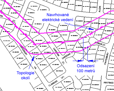 Pomocí analýzy okolí lze zobrazit oblast okolo existující topologie. V tomto případě analýza okolí síťové topologie elektrického vedení vytvoří novou polygonovou topologii.