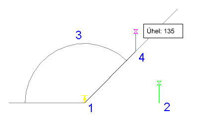 Vyberte čáru, od které budete úhlovou odchylku měřit. Zvolte buď existující čáru na výkrese, nebo zadejte počáteční a koncový bod (1 a 2) čáry. Následně zadejte úhlovou odchylku (3) a vzdálenost k počátečnímu bodu (4).