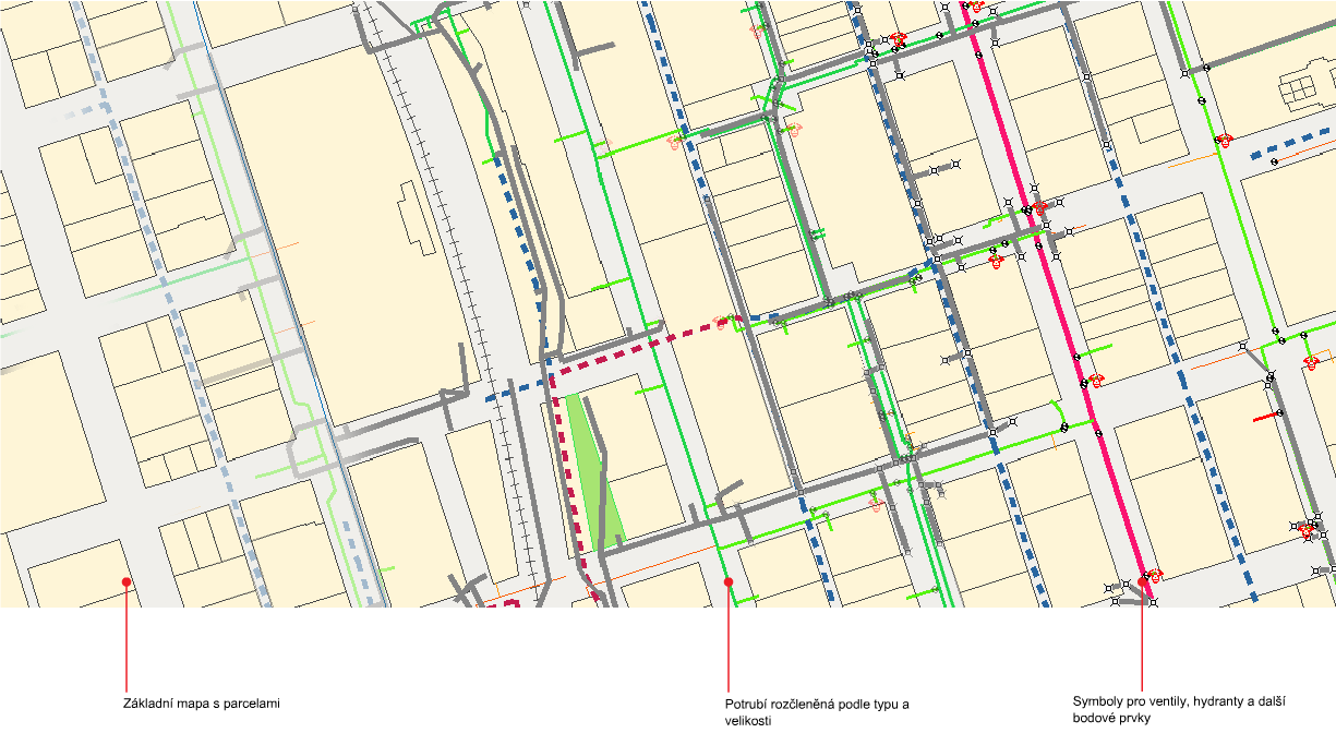 Tato mapa vodovodního systému je vytvořena z prvků uložených v sadě souborů SDF.