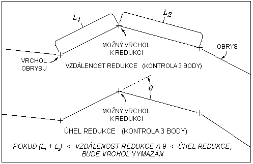 Bod na 3D křivce je vyčištěn výpočtem jeho umístění vzhledem k vrcholům před a za ním. Jestliže je délka mezi těmito třemi body menší než hodnota délky vyčištění a průhyb úhlu je menší než hodnota úhlu vyčištění, prostřední bod nebude přidán do datového souboru vrstevnice.