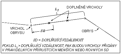 Pomocí faktorů doplnění můžete přidat vrcholy k 3D křivkám. Vzdálenost doplnění je maximální vzdálenost mezi vrcholy. Jestliže je vzdálenost mezi vrcholy vrstevnice větší než faktor doplnění, do vrstevnice se přidají body v rovnoměrných intervalech, které jsou menší nebo stejné jako vzdálenost doplnění. Čím je menší vzdálenost, tím bude větší počet doplněných bodů.
