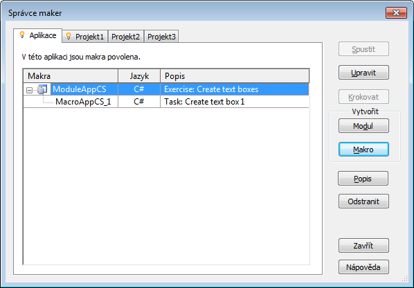 - V nástroji Správce maker vyberte kartu Aplikace (pro makra na úrovni aplikace) nebo kartu Projekt (pro makra na úrovni dokumentu), kam bude makro umístěno.