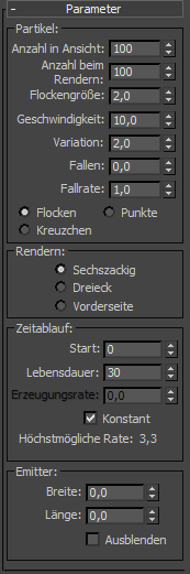 Die Emitterparameter legen Sie im Bereich "Emitter" im Rollout "Parameter" des Partikelsystems fest.