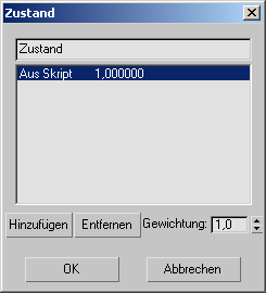 Im Dialogfeld "Zustand" können Sie dem Zustand eines kognitiven Controllers in einer Crowd-Simulation Verhaltensweisen hinzufügen und diese aus ihm entfernen sowie jeweils eine Gewichtung angeben.