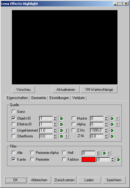 Wenn Sie in der Dropdown-Liste der Bildfilteraktionen "Lens Effects Highlight" wählen und auf "Einrichten" klicken, zeigt 3ds Max das Dialogfeld "Lens Effects Highlight".