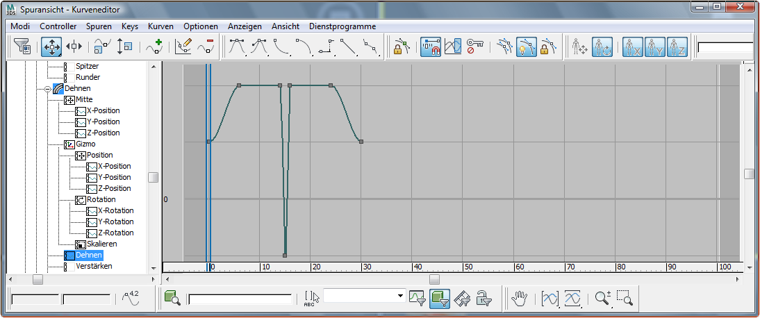 Controller-Fenster die Spur für den Parameter "Dehnung". Die Baumhierarchie ist folgendermaßen gegliedert: Basketball