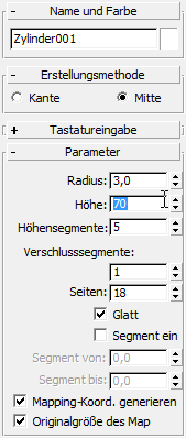 Unmittelbar nach der Erstellung eines Objekts können Sie Parameter wie beispielsweise Größe und Form anpassen, indem Sie die Werte in der Erstellungsgruppe im Rollout "Parameter" ändern.