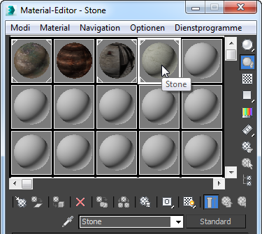 (Schattiertes Material im Ansichtsfenster zeigen). Diese Schaltfläche befindet sich in der Schaltflächenreihe unter den Musterfeldern. Wenn Sie das Musterfeld für das Material Stein zuerst nicht sehen können, klicken Sie mit der rechten Maustaste auf die Musterfelder und wählen Sie 5 X 3 Musterfenster, um mehr Felder anzuzeigen.
