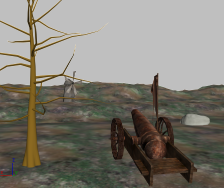 Sie können die Szenenobjekte realistischer gestalten, indem Sie den Oberflächen Materialien hinzufügen. Die Materialtextur kann Informationen aus Bitmap-Bildern sowie Relief-Maps für 3D-Effekte enthalten. In diesem Lehrgang erhalten das Schlachtfeldgelände sowie Baum, Felsen, Kanone und Windmühle ihr Erscheinungsbild durch Bitmap-Textur-Mapping.