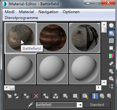 "Kompakter Material-Editor ". Standardmäßig zeigt der kompakte Material-Editor sechs Musterfelder an, von denen jedes ein Material aufnehmen kann. Üblicherweise stehen mehrere Materialien zur Auswahl. Daher können Sie die Anzahl der Musterfelder vergrößern, aus denen im Editor ausgewählt werden kann.