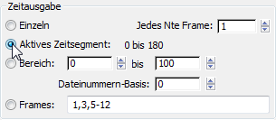 Wählen Sie im Bereich "Zeitausgabe" die Option "Aktives Zeitsegment". (Wenn Sie für die Einstellung "Einzeln" belassen haben, wird nur der zurzeit angezeigte Frame gerendert.)