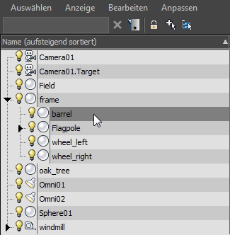 - Erweitern Sie im Szenen-Explorer auf der linken Seite des Ansichtsfensters den Eintrag Frame, wenn nötig, und klicken Sie dann auf den Eintrag Zylinder, um das Zylinderobjekt auszuwählen.