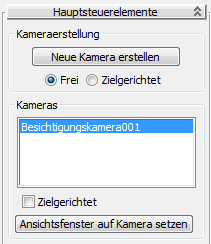 - Stellen Sie im Bereich "Kameraerstellung" im Rollout "Hauptsteuerelemente" sicher, dass die Option "Freie Kamera" ausgewählt ist, und klicken Sie anschließend auf "Neue Kamera erstellen".