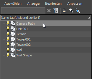 - Klicken Sie im Szenen-Explorer, um den Kamerapfad auszuwählen. Das Kamerapfad-Objekt ist ein Spline, dem die Kamera folgen soll.