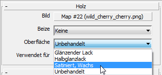 - Ändern Sie im Rollout "Holz" die Einstellung für "Finish" (Oberfläche) in "Satin Varnish" (Matter Lack) um.