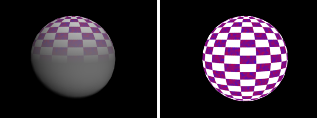 Die folgende Abbildung zeigt das in der vorstehenden Vorgehensweise beschriebene Beispiel. In der linken Abbildung sehen Sie das vollständige Material mit dem Rauschen innerhalb des Schachbretts, das sich im Verlauf befindet, und in der rechten Abbildung ist ein Shader-Element dargestellt, das nur das Rauschen innerhalb des Schachbretts enthält. Das Element rendert die gesamte Schachbrett-Map, selbst wenn nur ein Teil davon von der Verlaufs-Map verwendet wird.