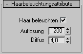 Im Rollout Haarbeleuchtungsattribute können Sie die Eigenschaften für das von der Lichtquelle erzeugte Haarschatten-Map anpassen. Dieses Rollout wird bei unterstützten Lichtquellen zur Renderzeit angezeigt. Wenn Sie die Haareinstellungen einer Lichtquelle vor der Renderzeit anpassen möchten, können Sie das Rollout explizit über die am Anfang dieses Themas in den Pfadangaben angeführten Schritte aufrufen.