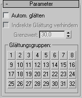 Das Raster der 32 Schaltflächen zeigt, welche Glättungsgruppen von den ausgewählten Flächen verwendet werden. Es dient außerdem auch dazu, Glättungsgruppen ausgewählten Flächen manuell zuzuweisen.