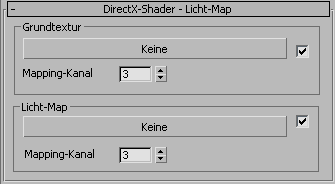 Wenn Sie "Licht-Map" als DirectX-Ansichtsfenstershader ausgewählt haben, wird dieses Rollout angezeigt. Der Shader "Licht-Map" kann sowohl ein Grundtextur- als auch ein Beleuchtungs-Map anzeigen. In der Regel entstehen beide Maps beim Rendern in Texturen (Einbacktexturen). Bei der Grundtextur handelt es sich normalerweise um ein abgeschlossenes Map, ein Misch-Map oder ein Streu-Map. Sie können sowohl diese Map-Arten als auch "Beleuchtungs-Map" wählen, um eine Renderausgabe als Elemente einer Einbacktextur auszuführen.