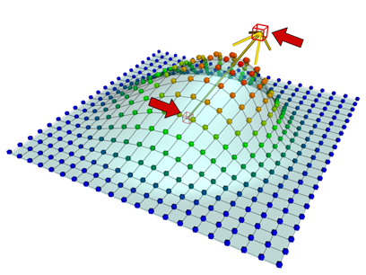 Mit "Bereich beeinflussen" können bei der Transformierung der ausgewählten Scheitelpunkte auch Scheitelpunkte im Bereich um die Auswahl herum in einem kleineren oder größeren Ausmaß transformiert werden. Der Effekt dieses Modifikators ist am einfachsten an einem flachen Objekt mit vielen Unterteilungen erkennbar.