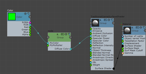 - Verbinden Sie das Attribut "RGB" des Farbknotens mit dem Attribut "MyColor" des Gruppenknotens.
