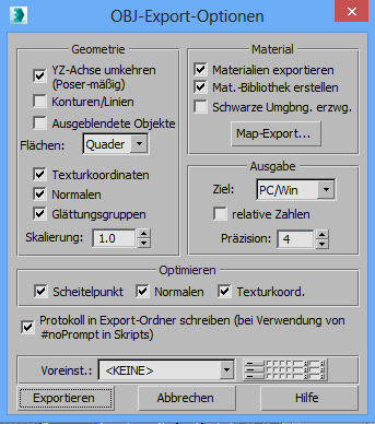 Wenn "Material verwenden" aktiviert, aber "Mat.-Bibliothek erstellen" deaktiviert wurde, enthält die OBJ-Datei eine Referenz auf eine MTL-Datei mit demselben Namen, aber die MTL-Datei wird nicht gespeichert. Mit dieser Option sparen Sie Zeit, wenn die MTL-Datei bereits vorhanden ist.