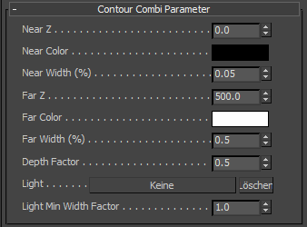 Bei Konturlinien, die z. B. zwischen 2 % Breite am Nahes-Z-Abstand und 1 % Breite am Far Z-Abstand interpoliert werden und die Hälfte der Breite für jeden Material-Layer jenseits von Far Z verlieren und bei denen die Breite auch von der Richtung der angegebenen Lichtquelle abhängt, legen Sie für "Light Min Width Factor" als Wert "0,5" fest.